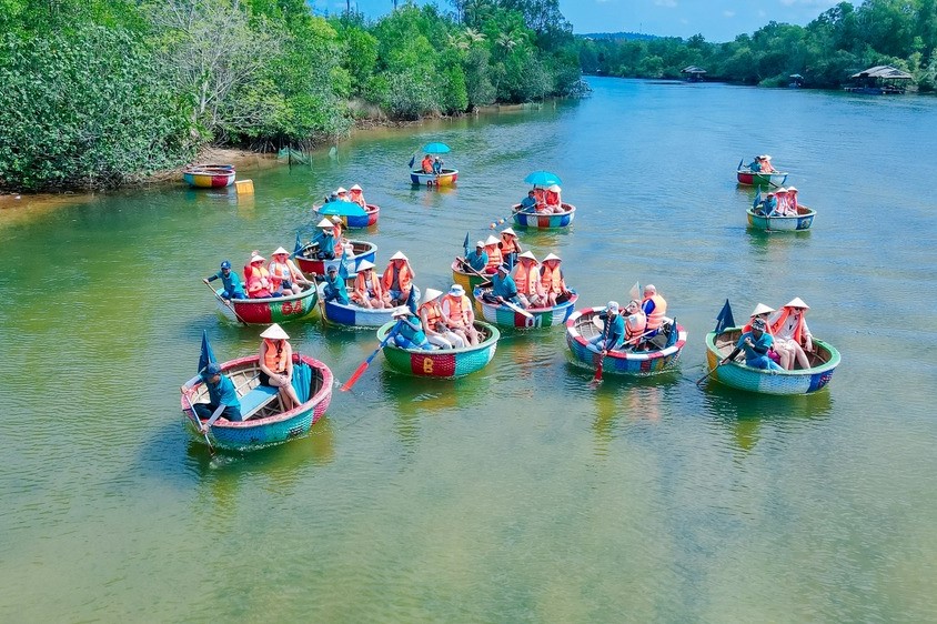 Tiếp nối hành trình, bạn sẽ được chèo thuyền thúng trên sông Cửa Cạn, len lỏi qua rừng ngập mặn, chiêm ngưỡng cảnh quan mộc mạc và lắng nghe câu chuyện văn hóa địa phương. Trải nghiệm trọn vẹn hơn với bữa trưa thực đơn ngon miệng bên dòng sông yên bình – một kết hợp hoàn hảo giữa thiên nhiên, ẩm thực và sự thư giãn.